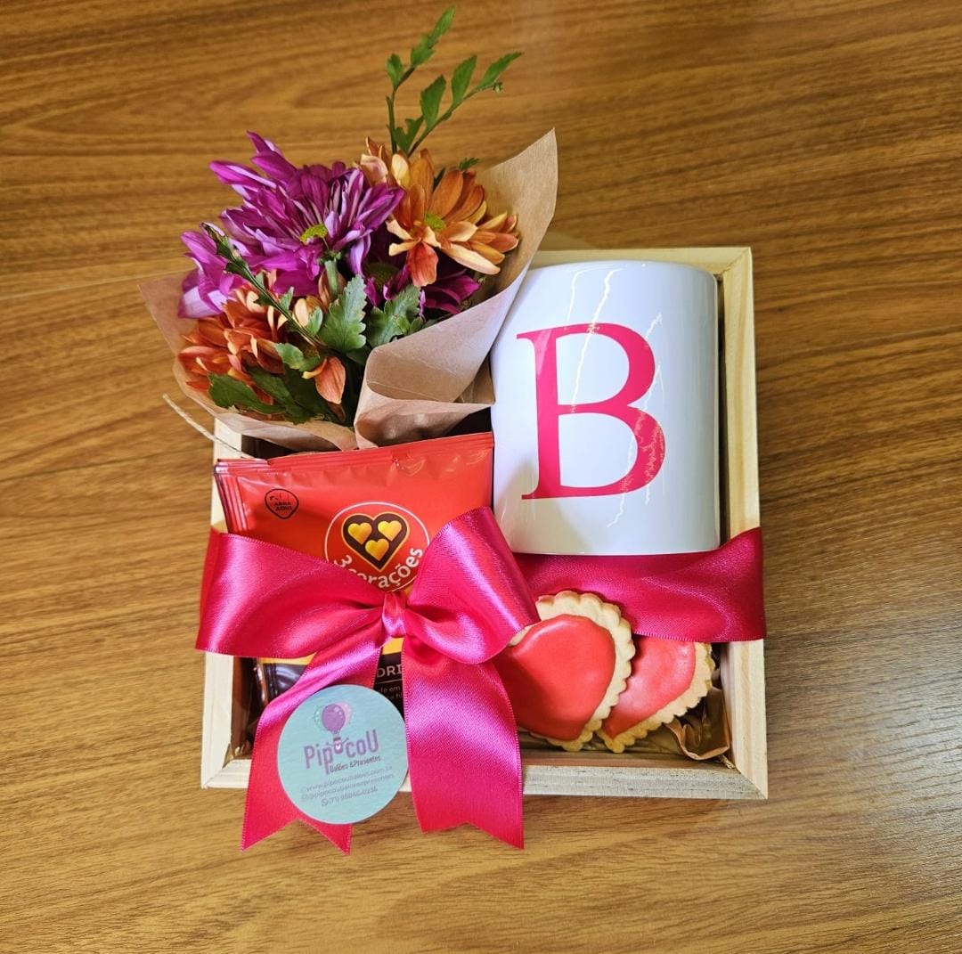 1 caneca de porcelana com a inicial do nome (Cor conforme disponibilidade);